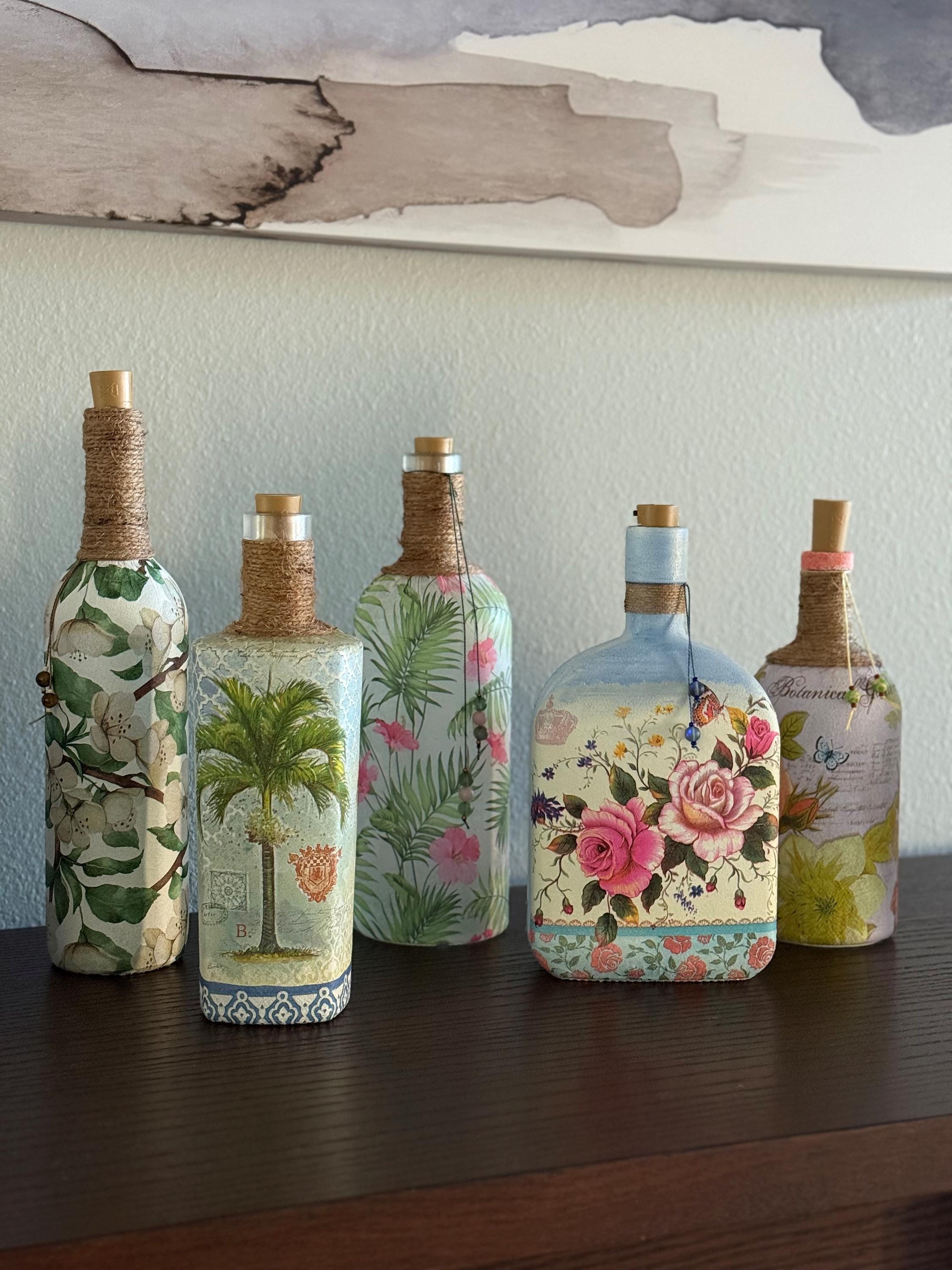 Repurposed/recycled bottle, hand painted, cork light and special decorations.
