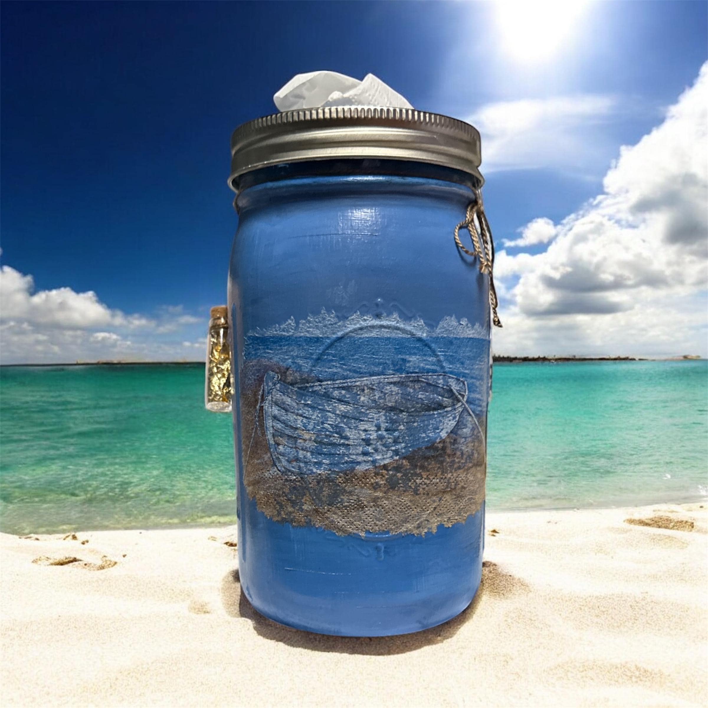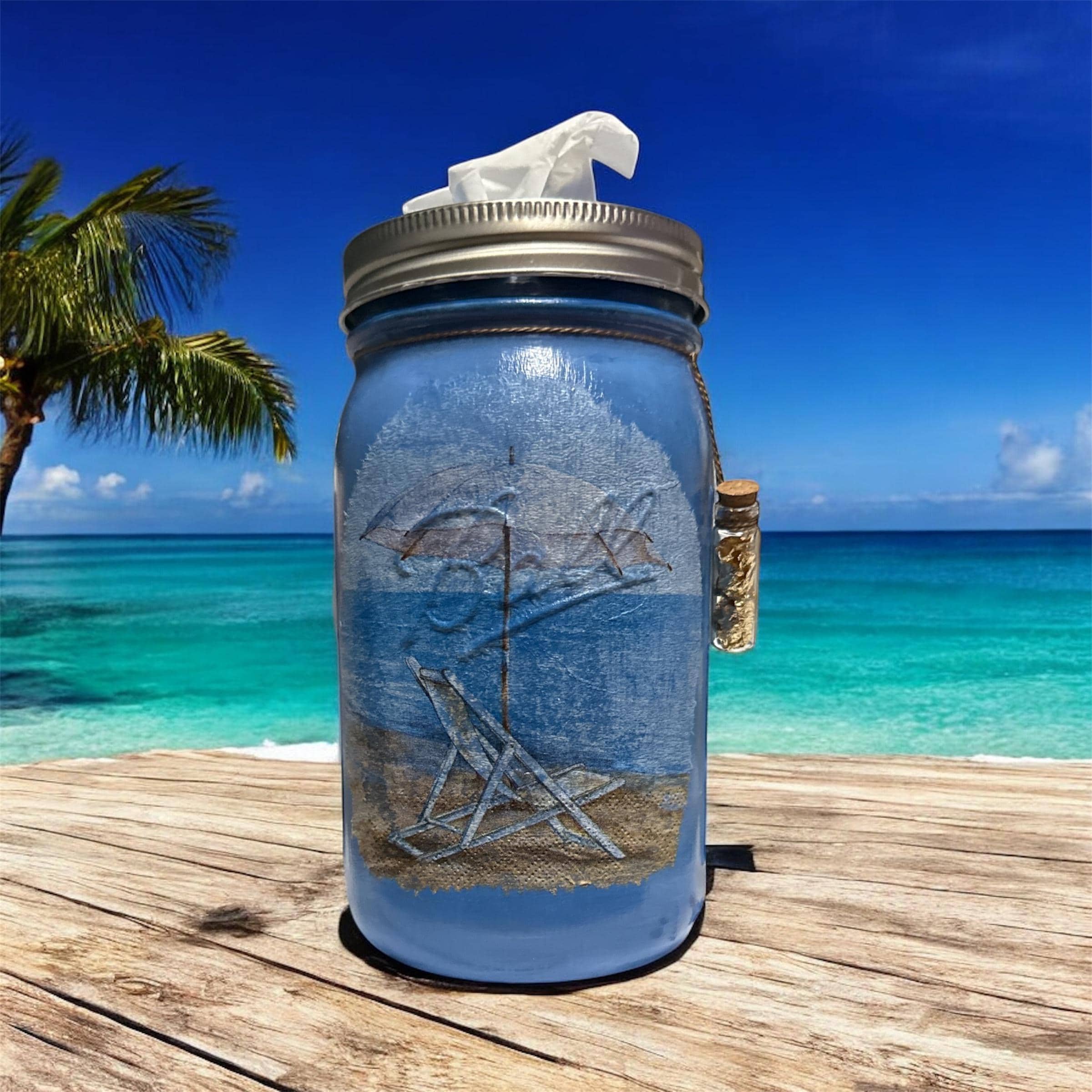 Decoupage beach design to painted mason jar. Repurposed into a tissue dispenser. Tissues not included.